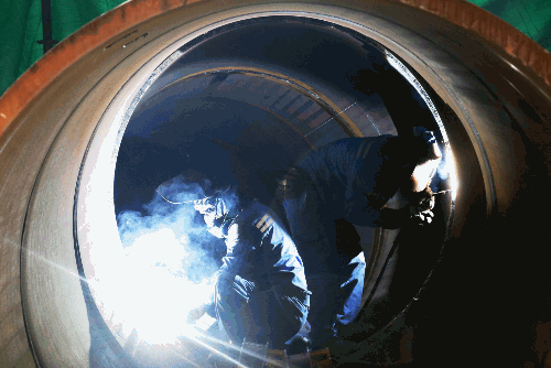 廣船國際首個吸力筒導(dǎo)管架風(fēng)機(jī)基礎(chǔ)施工現(xiàn)場,技術(shù)工人正在進(jìn)行管子焊接作業(yè)。