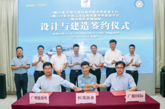 5月8日,中國船舶集團旗下廣船國際 與廣東省陽江市恒邦漁業(yè)有限公司簽訂1艘80米半潛式深遠海智能養(yǎng)殖旅游平臺建造合同,這是廣東省首個商業(yè)化大型半潛式養(yǎng)殖旅游綜合平臺。