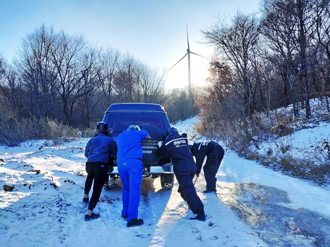進(jìn)入11月,內(nèi)蒙古自治區(qū)錫林郭勒盟地區(qū)迎來大面積的暴風(fēng)雪,烏達(dá)萊項(xiàng)目人員在趕往風(fēng)場的路上遭遇積雪路段,雖然氣候嚴(yán)寒,但為了及時消除機(jī)組故障,大家在積雪路段采取挖雪推車的方式齊心協(xié)力,一同開展清理路面積雪的行動。這個冬日,冰雪阻擋不住海裝追風(fēng)者們勇往直前的步伐,他們只為恪盡職守完成一個承諾——風(fēng)機(jī)旋轉(zhuǎn)、帶來光熱。