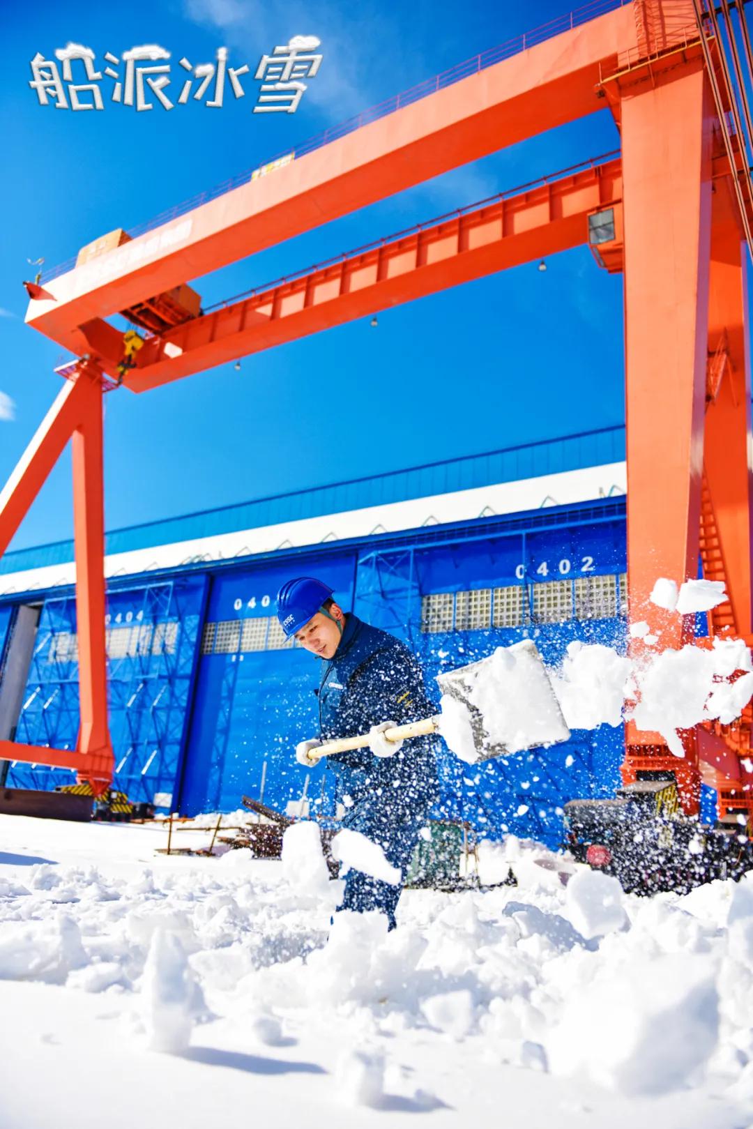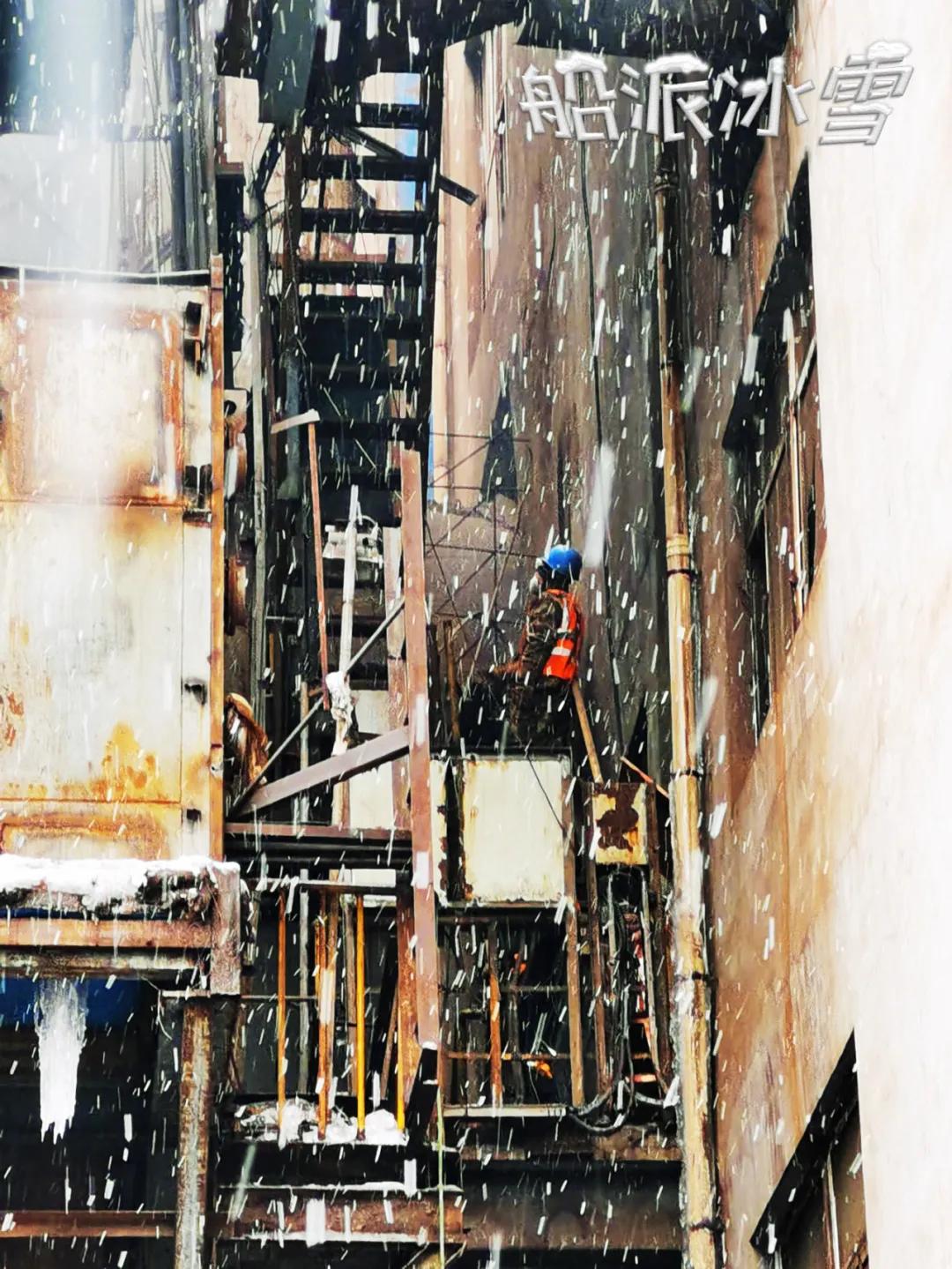 過(guò)膝的大雪掩埋了吊車的軌道,渤船小伙抄起“家伙”,為吊車開道,胳膊掄圓,雪花紛飛,別說(shuō)這畫面還真有點(diǎn)浪漫了。