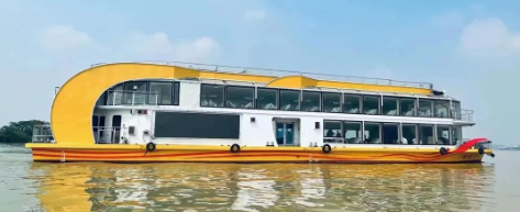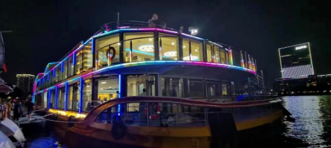 “廣游19”配置3015kWh純鋰電池驅動,Z形全回轉舵槳推進,經(jīng)濟航速下可滿足7小時續(xù)航要求。船體上建采用大面積玻璃幕墻,具有開闊的觀光視野,可360度觀賞珠江日景夜景,可提供江景游覽、娛樂餐飲、會議招待、婚禮、音樂舞會、年會等綜合服務。