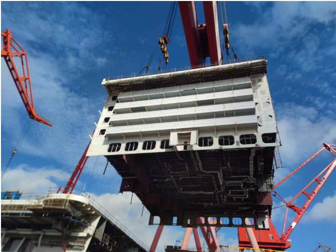 此次完成搭載的U2總段以乘客住艙區(qū)域為主,跨度為五層甲板,是郵輪搭載的首個帶陽臺的總段,其順利搭載是總段完整性建造速度提升和船塢快速搭載的集中體現(xiàn)。