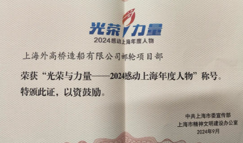 “光榮與力量——2024感動上海年度人物推選活動”獲獎名單日前揭曉。中國船舶集團外高橋造船郵輪項目部獲評“2024感動上海年度人物”。本次活動以2023年8月至2024年7月中,上海市涌現(xiàn)的事跡突出、精神可嘉、社會認可的模范人物和先進集體為推選對象,通過175萬市民網(wǎng)絡投票和專家評審推選出先進典型。