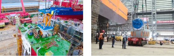 “夢想”號配備的7臺推進(jìn)器中,3臺全回轉(zhuǎn)伸縮推是黃埔文沖迄今總成過的最大伸縮推,并且建造過程中伸縮推需要進(jìn)行全程升降試驗,升降高度差達(dá)4.3米。完成試驗的伸縮推總段重量超過了船廠龍門吊最高900噸的起重能力?!皦粝搿碧柟に囏?fù)責(zé)人馮仕清創(chuàng)新性地提出了采用龍門吊和履帶吊聯(lián)合吊裝的方法,最終保證了伸縮推的成功安裝。