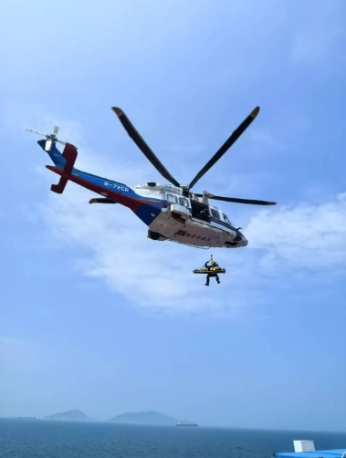 接報(bào)后,廣船國際立即啟動(dòng)航空救援,第一時(shí)間聯(lián)系海上航空救助和最近的珠海醫(yī)院,一場生死競速在南海的碧海藍(lán)天間極速展開!在交通運(yùn)輸部南海第一救助飛行隊(duì)、珠海市中山大學(xué)附屬第五醫(yī)院和試航項(xiàng)目組的通力協(xié)作下,半小時(shí)后,藍(lán)白相間的救援直升機(jī)飛臨懸停試航船舶的直升機(jī)平臺(tái)。