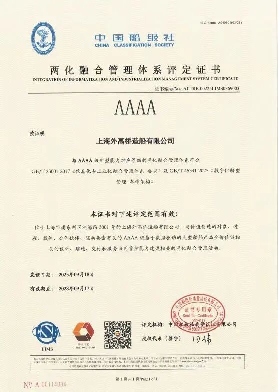 日前,全國兩化融合管理體系評定工作委員會公布兩化融合管理體系3.0和數(shù)字化轉(zhuǎn)型管理體系首批4A/5A級評定企業(yè)名單,中國船舶集團有限公司旗下外高橋造船成為首批29家獲證的企業(yè)之一,也成為首批獲得4A級認證的船海企業(yè)。