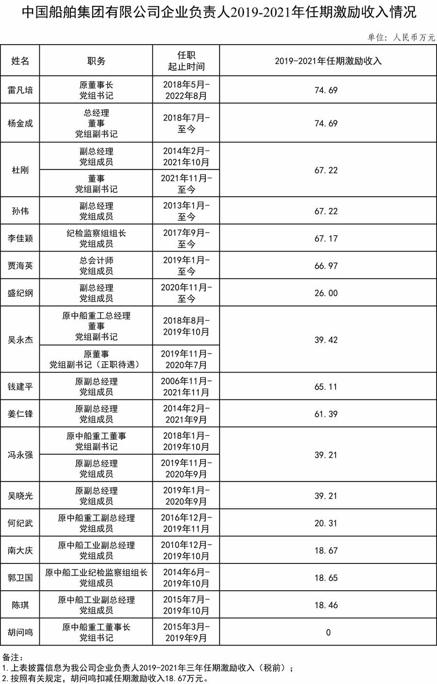 中國船舶集團有限公司企業(yè)負責(zé)人2019-2021年任期激勵收入情況