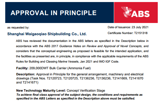 日前,中國船舶集團(tuán)旗下外高橋造船自主研發(fā)設(shè)計的21萬噸氨燃料動力散貨船獲得美國船級社(ABS)頒發(fā)的原則性認(rèn)可證書(AIP)。作為具有潛力的零碳燃料,氨燃料能滿足更加嚴(yán)格的溫室氣體排放要求,是未來脫碳航運(yùn)業(yè)中最有希望的替代燃料之一。氨燃料動力船型的推出,為航運(yùn)業(yè)提供一種零碳運(yùn)輸?shù)沫h(huán)保新方案。