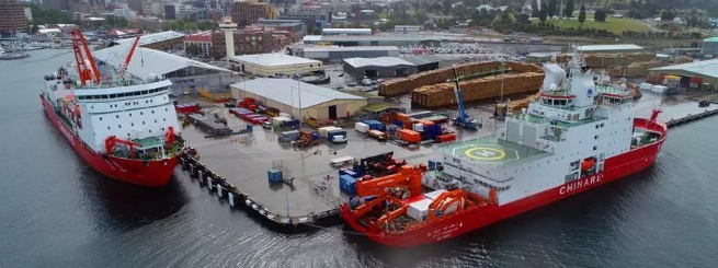 ????當(dāng)?shù)貢r(shí)間11月7日上午,搭載107名中國第36次南極考察隊(duì)員的“雪龍”號(hào)??堪拇罄麃喕舭吞馗劭?,與先行靠港的“雪龍2”號(hào)正式匯合。
