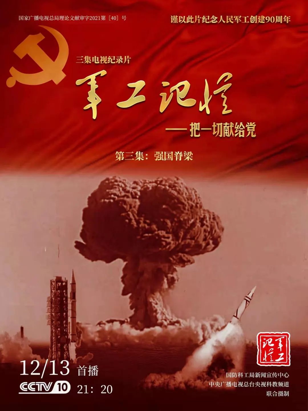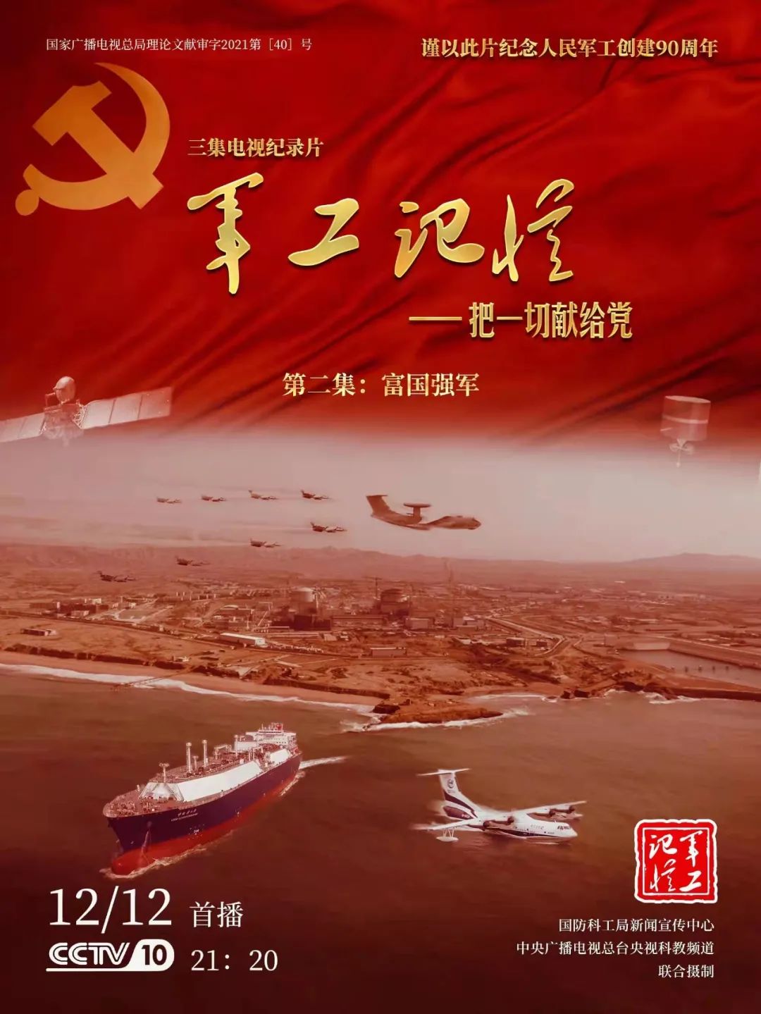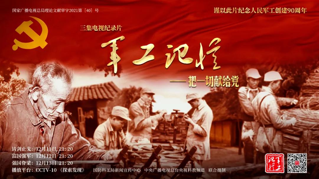為慶祝中國(guó)共產(chǎn)黨成立100周年,紀(jì)念黨領(lǐng)導(dǎo)下的人民軍工創(chuàng)建90周年,由國(guó)防科工局指導(dǎo),國(guó)防科工局新聞宣傳中心聯(lián)合中央廣播電視總臺(tái)社教節(jié)目中心攝制,各軍工集團(tuán)大力支持的3集重大理論文獻(xiàn)電視紀(jì)錄片《軍工記憶——把一切獻(xiàn)給黨》,將于12月11日21:20在央視科教頻道(CCTV-10)《探索發(fā)現(xiàn)》欄目首播,連續(xù)播出3天。該紀(jì)錄片旨在向建黨百年獻(xiàn)禮,向人民軍工90周年致敬,向全社會(huì)弘揚(yáng)軍工精神傳遞軍工文化,激勵(lì)國(guó)防科技工業(yè)戰(zhàn)線廣大干部職工不忘初心、接續(xù)奮斗,為實(shí)現(xiàn)強(qiáng)軍強(qiáng)國(guó)夢(mèng)想貢獻(xiàn)力量。