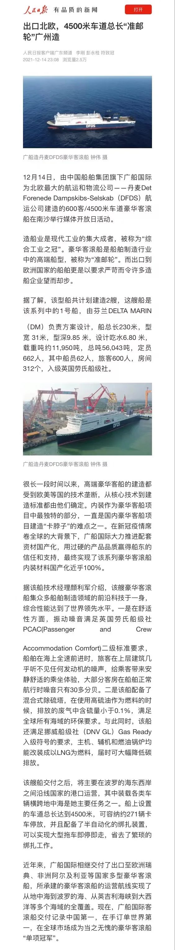 對(duì)這艘“準(zhǔn)郵輪”的高端船舶,媒體盛贊廣船國(guó)際在新冠疫情席卷全球的大背景下,大力推進(jìn)配套資材國(guó)產(chǎn)化,用過(guò)硬的產(chǎn)品品質(zhì)贏得船東的信任和支持,最終實(shí)現(xiàn)了該系列豪華客滾船內(nèi)裝材料國(guó)產(chǎn)化近乎100%,是當(dāng)之無(wú)愧的豪華客滾船“單項(xiàng)冠軍”。