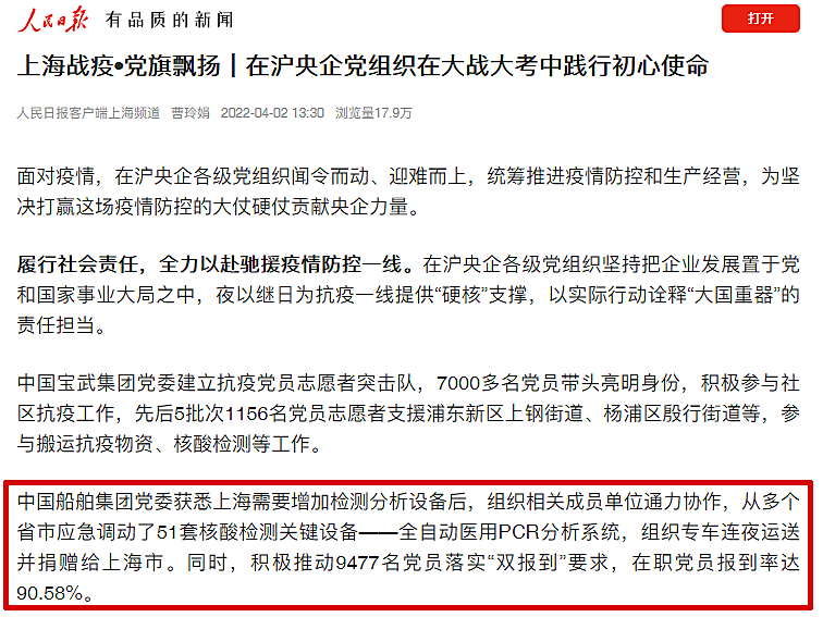 “中國(guó)船舶集團(tuán)黨組獲悉上海需要增加檢測(cè)分析設(shè)備后,組織相關(guān)成員單位通力協(xié)作,從多個(gè)省市應(yīng)急調(diào)動(dòng)了51套核酸檢測(cè)關(guān)鍵設(shè)備——全自動(dòng)醫(yī)用PCR分析系統(tǒng),組織專(zhuān)車(chē)連夜運(yùn)送并捐贈(zèng)給上海市。同時(shí),積極推動(dòng)9477名黨員落實(shí)‘雙報(bào)到’要求,在職黨員報(bào)到率達(dá)90.58%。”