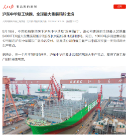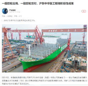 5月19日,中國船舶集團旗下滬東中華雙喜臨門。其建造的全球最大裝箱量24000TEU超大型集裝箱船2號船在長興造船基地順利出塢;建造的13000噸多用途重吊船12號船在浦東廠區(qū)命名交付,標志著該項目圓滿收官。這是滬東中華自復工復產(chǎn)以來首次實現(xiàn)一天完成兩大生產(chǎn)節(jié)點。