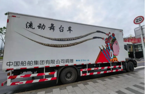 在中國(guó)船舶廣場(chǎng)揭牌儀式現(xiàn)場(chǎng),一輛印有中國(guó)船舶集團(tuán)有限公司捐贈(zèng)的流動(dòng)舞臺(tái)車(chē)格外醒目,工作人員告訴記者:“過(guò)去送文化下鄉(xiāng)巡回演出,由于需要不斷改變巡演地點(diǎn),刮風(fēng)下雨就只能‘望雨興嘆’,現(xiàn)在有了移動(dòng)舞臺(tái)車(chē),10分鐘內(nèi)就將所有設(shè)備安裝到位,并且車(chē)內(nèi)預(yù)留了燈光、聲音、字幕、幕布、電源等接口,具有很好的擴(kuò)展性,車(chē)上的舞臺(tái)滿(mǎn)足了專(zhuān)業(yè)演出的需求,可以讓整個(gè)演出更具表演性,舞臺(tái)車(chē)可以直接開(kāi)進(jìn)百姓家,鄉(xiāng)親們家門(mén)口就能看表演,感謝中國(guó)船舶集團(tuán)讓文化下鄉(xiāng)不再難?!臂屡D縣民族文化工作隊(duì)隊(duì)長(zhǎng)安飄感激地說(shuō):“感謝中國(guó)船舶集團(tuán)對(duì)邊疆文化的關(guān)心,我們一定會(huì)守好文化邊疆!”。