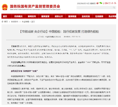 【編者按】6月13日,第32個(gè)全國節(jié)能宣傳周開啟。節(jié)能是生態(tài)文明建設(shè)的重要內(nèi)容,是推進(jìn)碳達(dá)峰碳中和、促進(jìn)高質(zhì)量發(fā)展的重要支撐。中央企業(yè)努力爭(zhēng)當(dāng)能源清潔低碳轉(zhuǎn)型的推動(dòng)者、先行者、引領(lǐng)者,“十三五”期間,央企能源消費(fèi)總量、碳排放總量得到有效控制,能源消耗強(qiáng)度、碳排放強(qiáng)度、主要污染物排放總量持續(xù)大幅下降。6月16日,國資委網(wǎng)站在“節(jié)能減碳 央企行動(dòng)”系列報(bào)道中,展示中國船舶集團(tuán)有限公司促進(jìn)社會(huì)綠色低碳的生動(dòng)實(shí)踐。