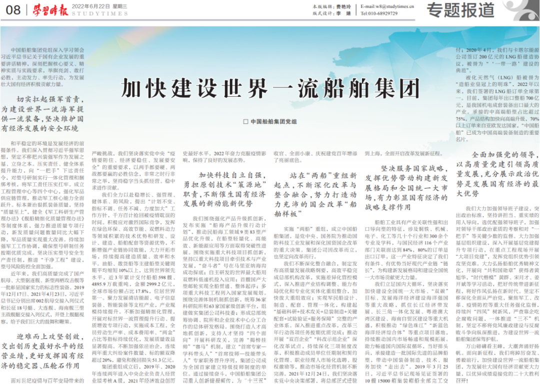 6月22日,《學(xué)習(xí)時報》發(fā)表中國船舶集團黨組署名文章《加快建設(shè)世界一流船舶集團》,萬山磅礴看主峰,大潮奔涌好揚帆,面向新征程,中國船舶集團將踔厲奮發(fā)、勇毅前行,為發(fā)展壯大國有經(jīng)濟貢獻(xiàn)更大力量,以優(yōu)異成績迎接黨的二十大勝利召開。