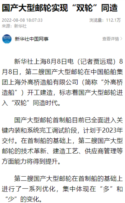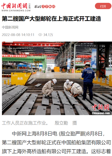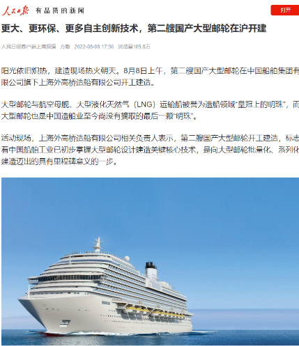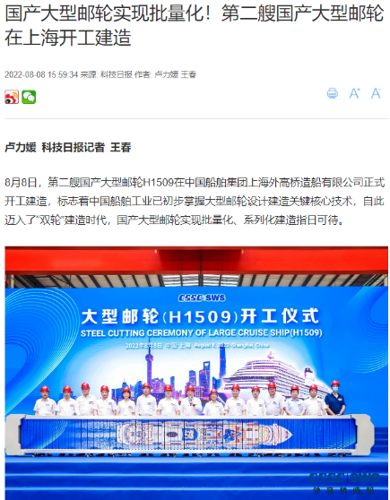 8月8日,第二艘國產(chǎn)大型郵輪在中國船舶集團旗下外高橋造船開建,這標志著中國船舶工業(yè)已初步掌握大型郵輪設計建造關(guān)鍵核心技術(shù)。