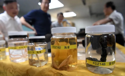 3月11日,“探索一號”科考船攜“奮斗者”號全海深載人潛水器抵達(dá)三亞,科研人員在介紹采集的深淵宏生物、巖石、結(jié)核、沉積物樣品。新華社記者 陳凱姿 攝