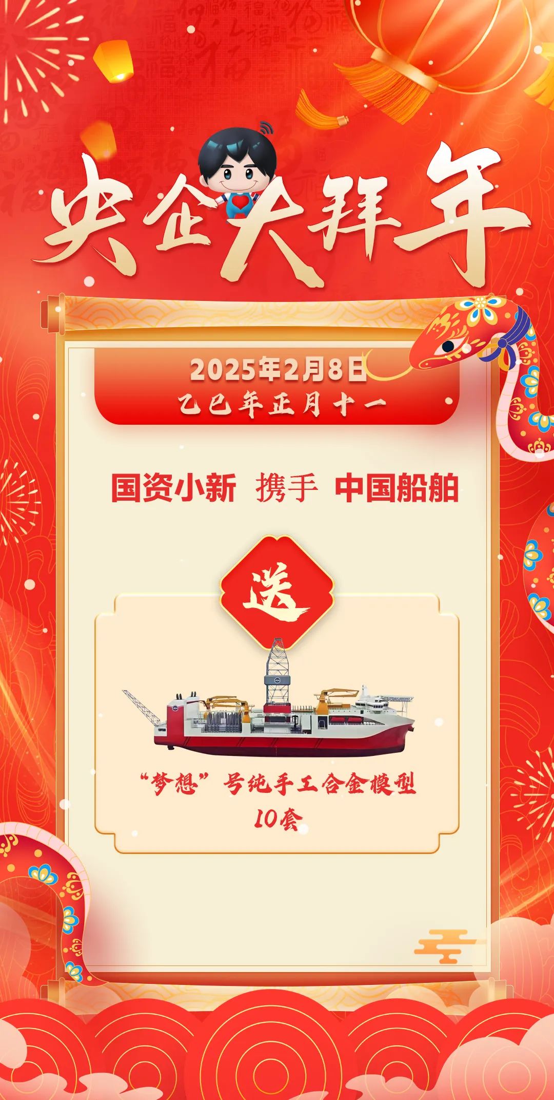 1月25日(臘月二十六)至2月12日(正月十五),“國(guó)資小新”攜手19家中央企業(yè)連續(xù)19天在微博平臺(tái)為粉絲網(wǎng)友送上新年禮包和新春祝福!