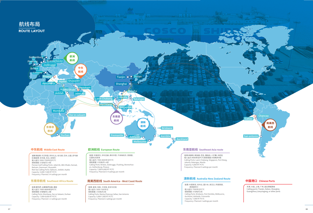 根據(jù)客戶需求,中遠(yuǎn)海運(yùn)協(xié)同船隊(duì)與港口優(yōu)化航線設(shè)置和運(yùn)力配置,靈活調(diào)整全球航線布局,開通中東波斯灣、東南亞、歐洲、墨西哥、中南美洲、非洲等班輪航線,為客戶定制商品車運(yùn)輸整體解決方案,提供多船型、全程端到端物流服務(wù)。