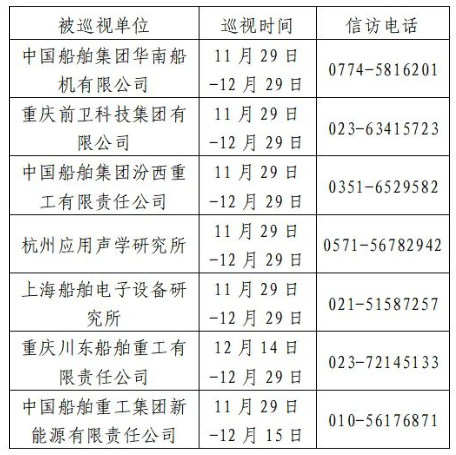 根據(jù)中國(guó)船舶集團(tuán)黨組2023年第二輪巡視工作部署,截至2023年11月29日,巡視工作已經(jīng)鋪開(kāi)。其中,對(duì)中國(guó)船舶集團(tuán)華南船機(jī)有限公司、重慶前衛(wèi)科技集團(tuán)有限公司、中國(guó)船舶集團(tuán)汾西重工有限責(zé)任公司、杭州應(yīng)用聲學(xué)研究所、上海船舶電子設(shè)備研究所等5家單位開(kāi)展常規(guī)巡視,對(duì)重慶川東船舶重工有限責(zé)任公司、中國(guó)船舶重工集團(tuán)新能源有限責(zé)任公司等2家單位開(kāi)展專(zhuān)項(xiàng)巡視。