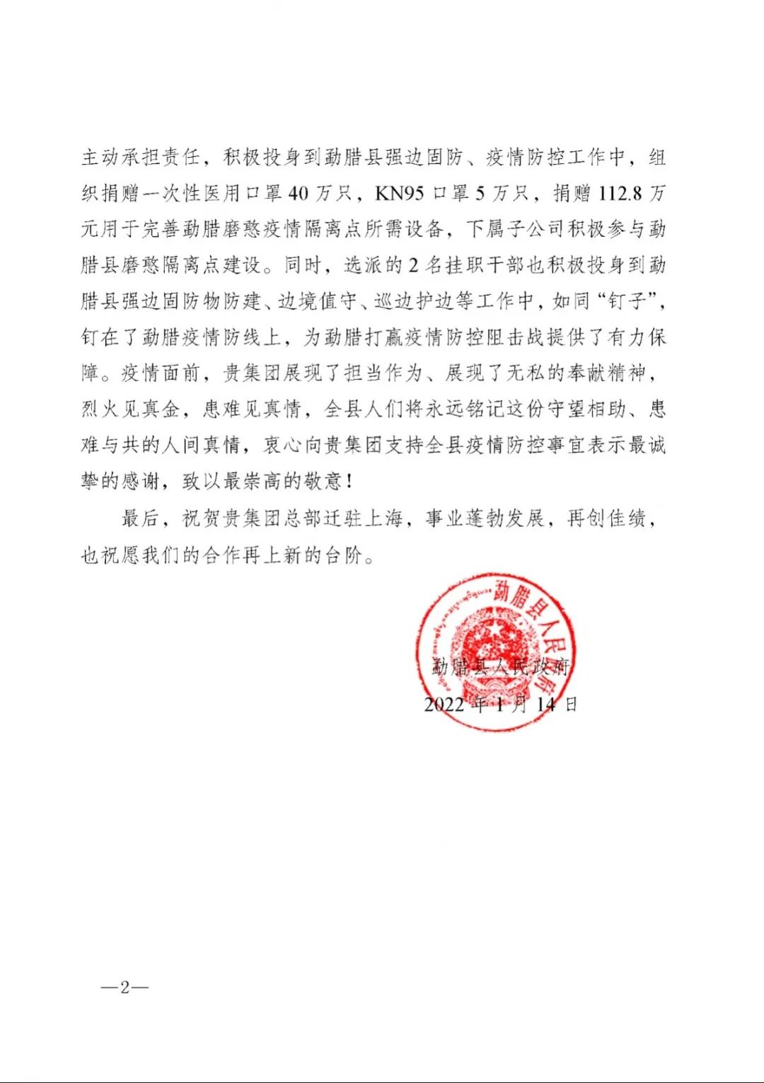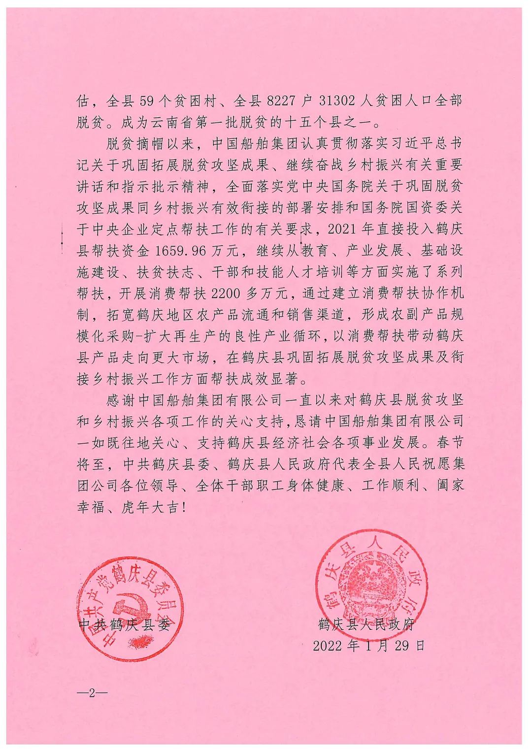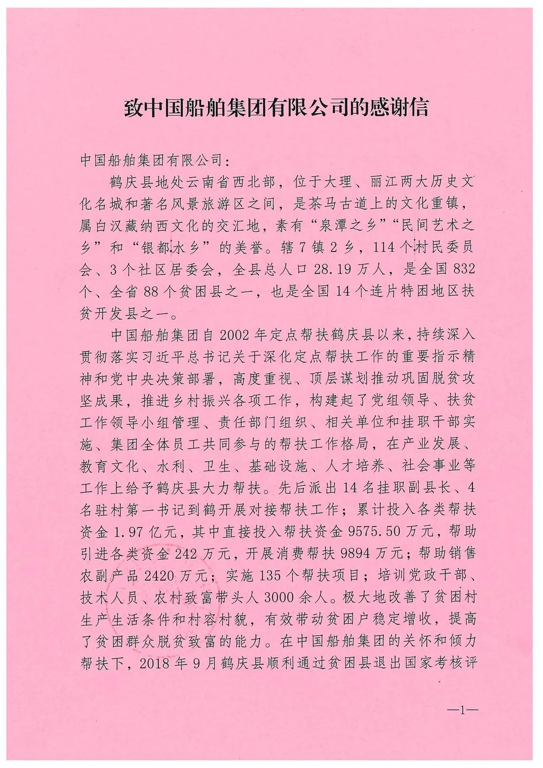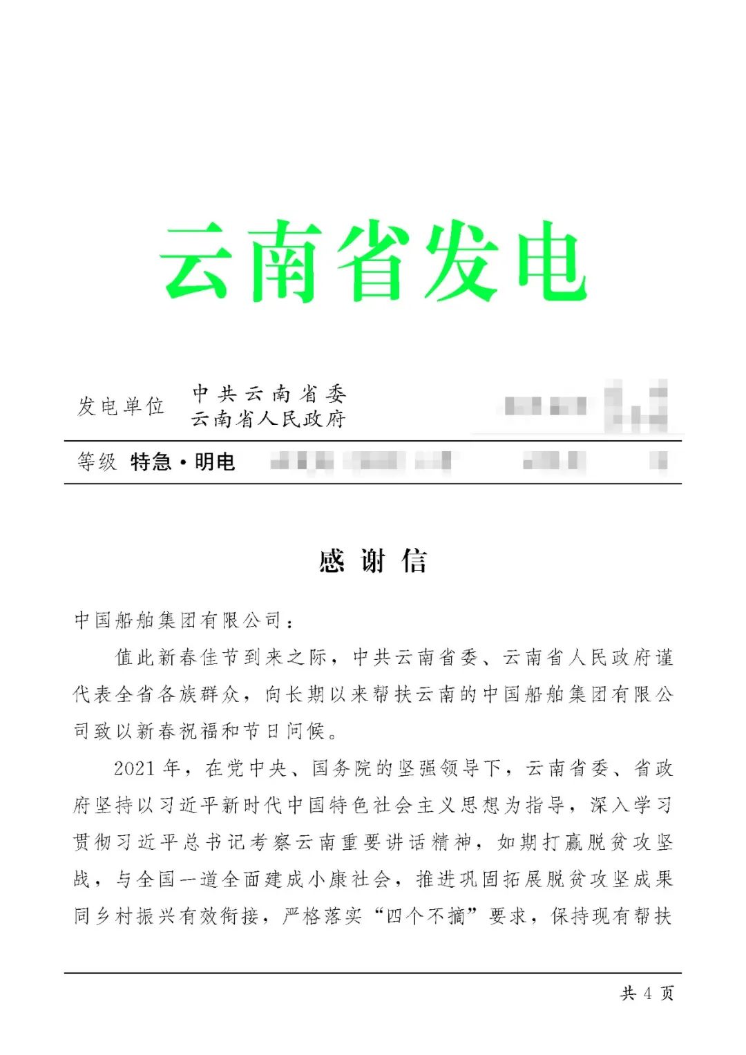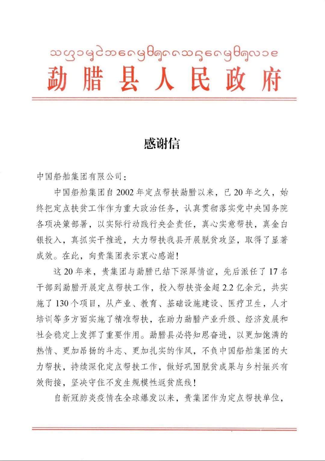 春節(jié)前夕,中國(guó)船舶集團(tuán)陸續(xù)收到云南省委省政府、文山州委州政府、鶴慶縣委縣政府、勐臘縣政府發(fā)來(lái)的感謝信,對(duì)集團(tuán)公司長(zhǎng)期以來(lái)給予鶴慶縣、勐臘縣、丘北縣的傾力幫扶表示衷心感謝和崇高敬意。