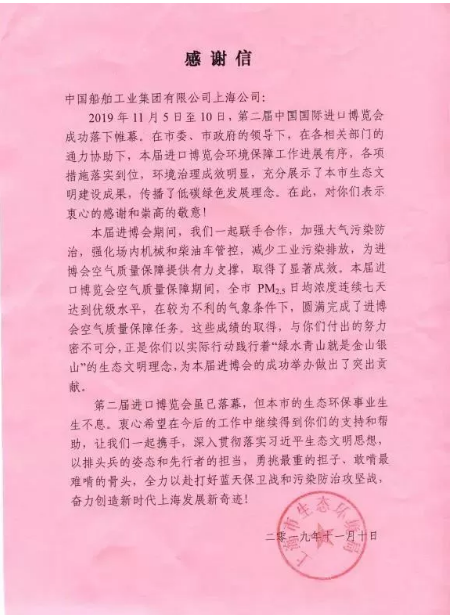????近日,中國船舶集團(tuán)有限公司所屬中船上海船舶工業(yè)有限公司收到了一封來自上海市生態(tài)環(huán)境局的感謝信! 對中船上海地區(qū)企業(yè)在第二屆中國國際進(jìn)口博覽會期間的環(huán)保管控和減排工作進(jìn)行了充分肯定。
